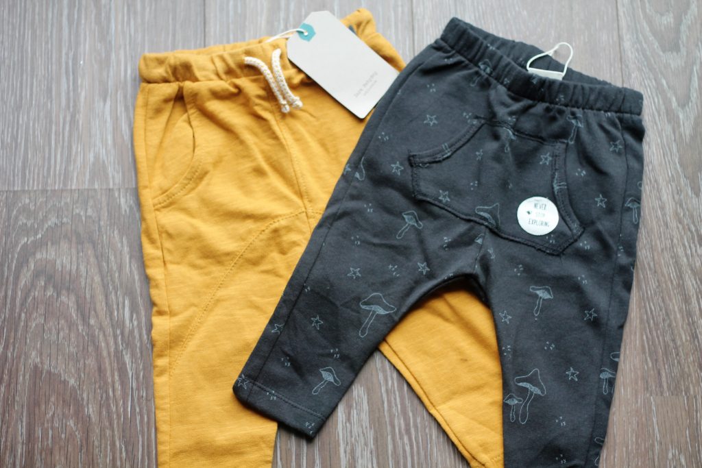 Ik heb tot nu toe in elke maat een okergeel broekje gehad, deze kleur staat hem echt heel leuk. De zwarte met de paddenstoelen is ook heel schattig en makkelijk te combineren.