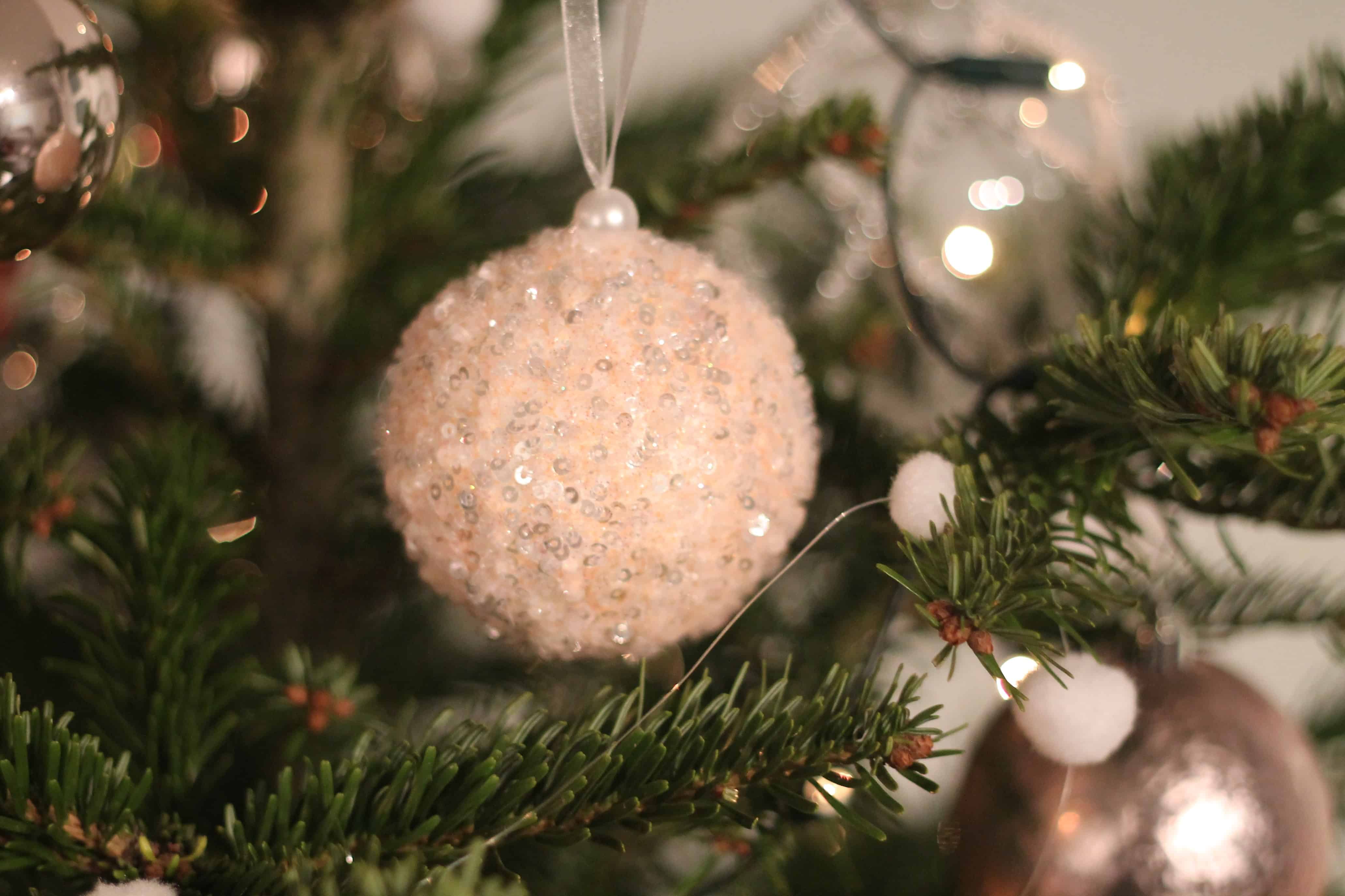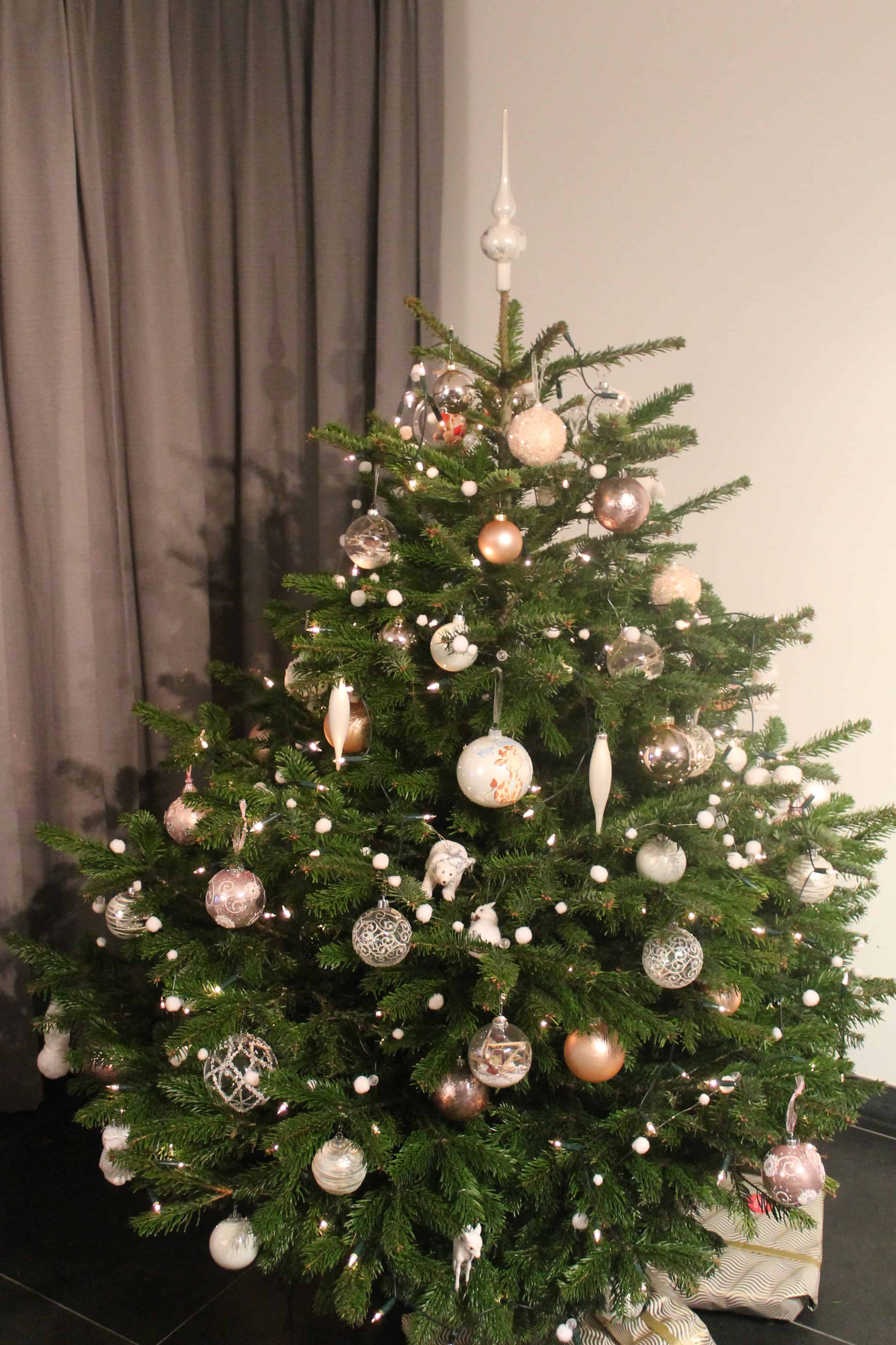 Dit jaar wilden we niet zo’n hele grote boom. We hebben een box in de kamer staan en als er dan ook nog een gigantische boom bij zou komen werd het wel heel vol. We hebben nu een medium boom die mooi in de hoek voor het raam past. Een aantal jaar geleden ben ik begonnen met een mooie verzameling kerstballen en deze roze en witte pronken ook nu weer mooi in de boom.