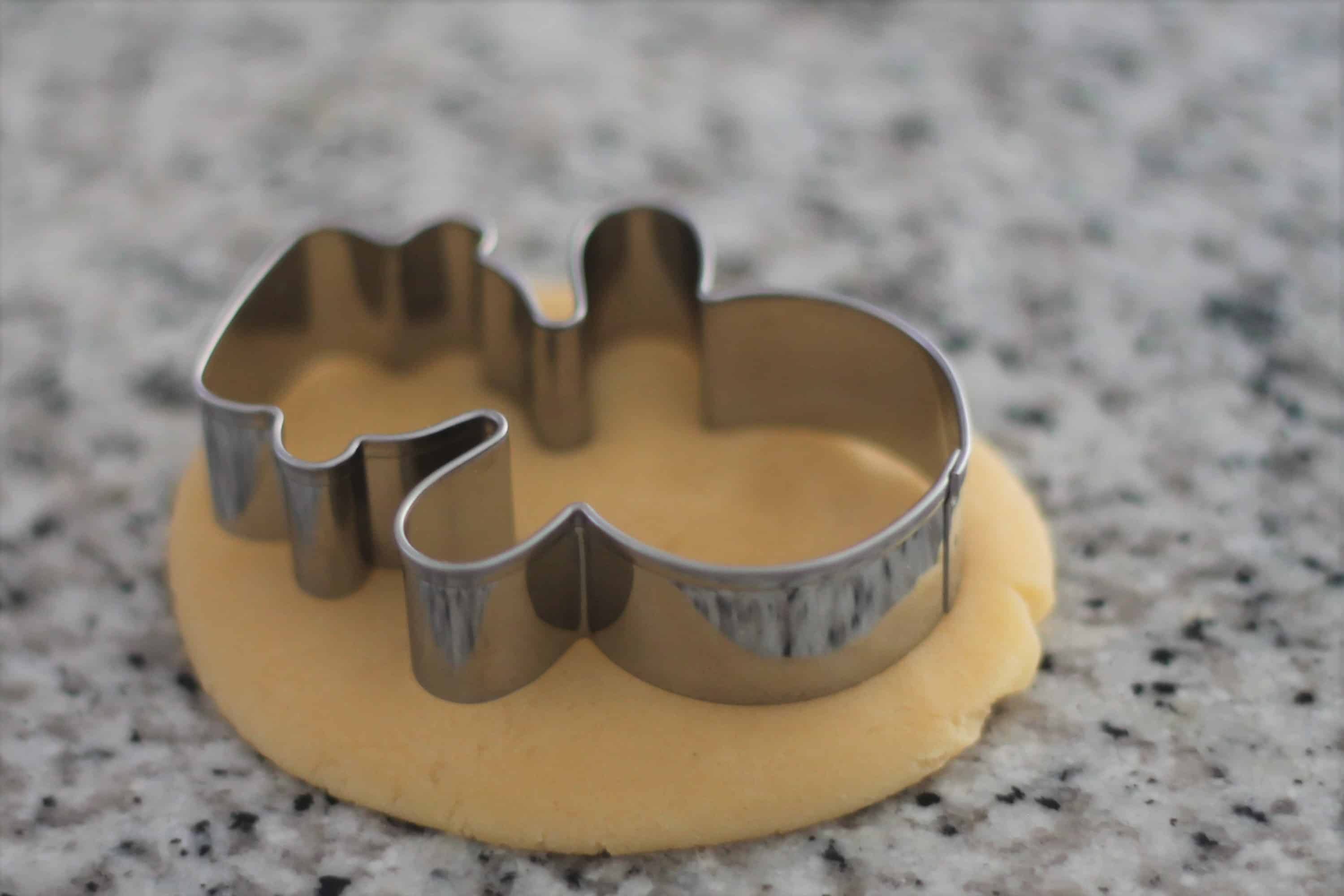 Verwarm de oven voor op 150 graden (hetelucht, anders 170 graden). Doe de boter, vanillesuiker en basterdsuiker bij elkaar en mix deze door tot een glad beslag. Voeg de bloem, eidooier en het bakpoeder toe en kneed het tot een elastisch deeg. Laat het deeg 10 minuten rijzen in de koelkast.